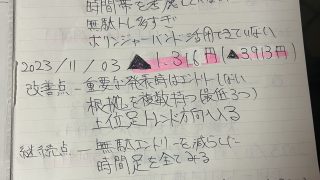 以前2023年11月2日から2週間ほど取引していた時のFX収支ノートがあったのでアップしたいと思います。毎日の収支額と反省点を記録しながらやっていた時のノートの写真です。2023年11月14日に支払いがあり出金して退場です。何も考えずに取引...